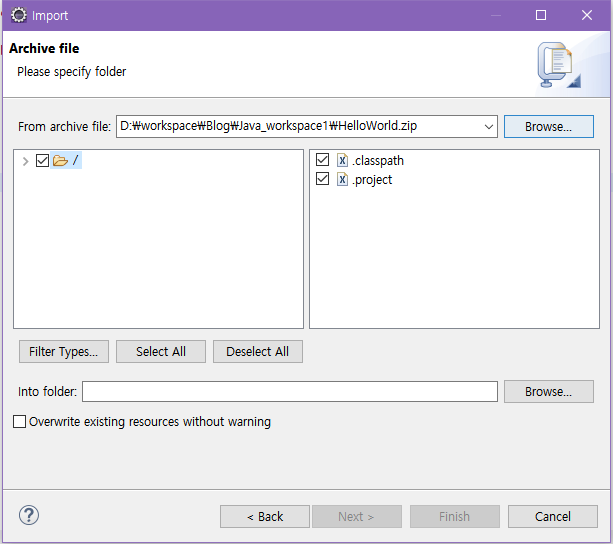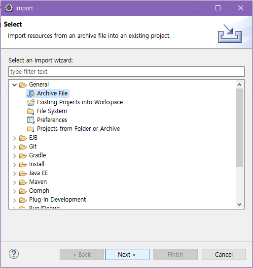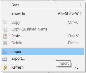 - ์๋จ ๋ฉ๋ด์ [File]์ด๋ [Package Explorer]์์ [Import...] ํด๋ฆญ