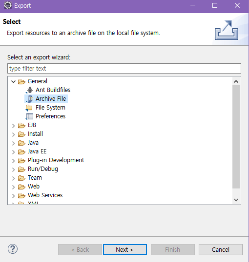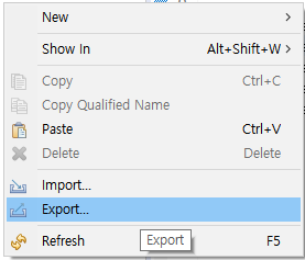- ์๋จ ๋ฉ๋ด์ [File]์ด๋ [Package Explorer]์์ [Export...] ํด๋ฆญ