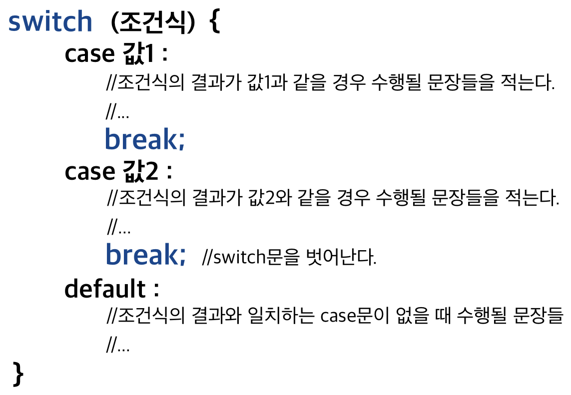- switch문의 조건식 결과는 정수 또는 문자열이어야 한다.