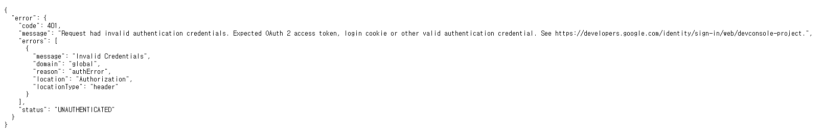 ์์ฒญ์ ์๋ชป๋ ์ธ์ฆ ์๊ฒฉ ์ฆ๋ช ์ด ์์ต๋๋ค. OAuth 2 ์ก์ธ์ค ํ ํฐ, ๋ก๊ทธ์ธ ์ฟ ํค ๋๋ ๊ธฐํ ์ ํจํ ์ธ์ฆ ์๊ฒฉ ์ฆ๋ช ์ด ํ์ํฉ๋๋ค. https://developers.google.com/identity/sign-in/web/devconsole-project๋ฅผ ์ฐธ์กฐํ์ธ์.