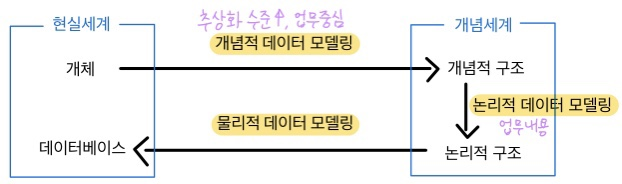 - ์ค๊ณ : ๋ฌผ๋ฆฌ์ ๋ฐ์ดํฐ ๋ชจ๋ธ๋ง => ํ์ค ํ๋ก์ ํธ์์๋ ๊ฐ๋ ์ ๋ฐ์ดํฐ ๋ชจ๋ธ๋ง์ ์๋ตํ๊ณ ๋ถ์ ๋จ๊ณ์์ ๊ฐ๋ /๋ ผ๋ฆฌ์ ๋ฐ์ดํฐ ๋ชจ๋ธ๋ง์ ์ํ